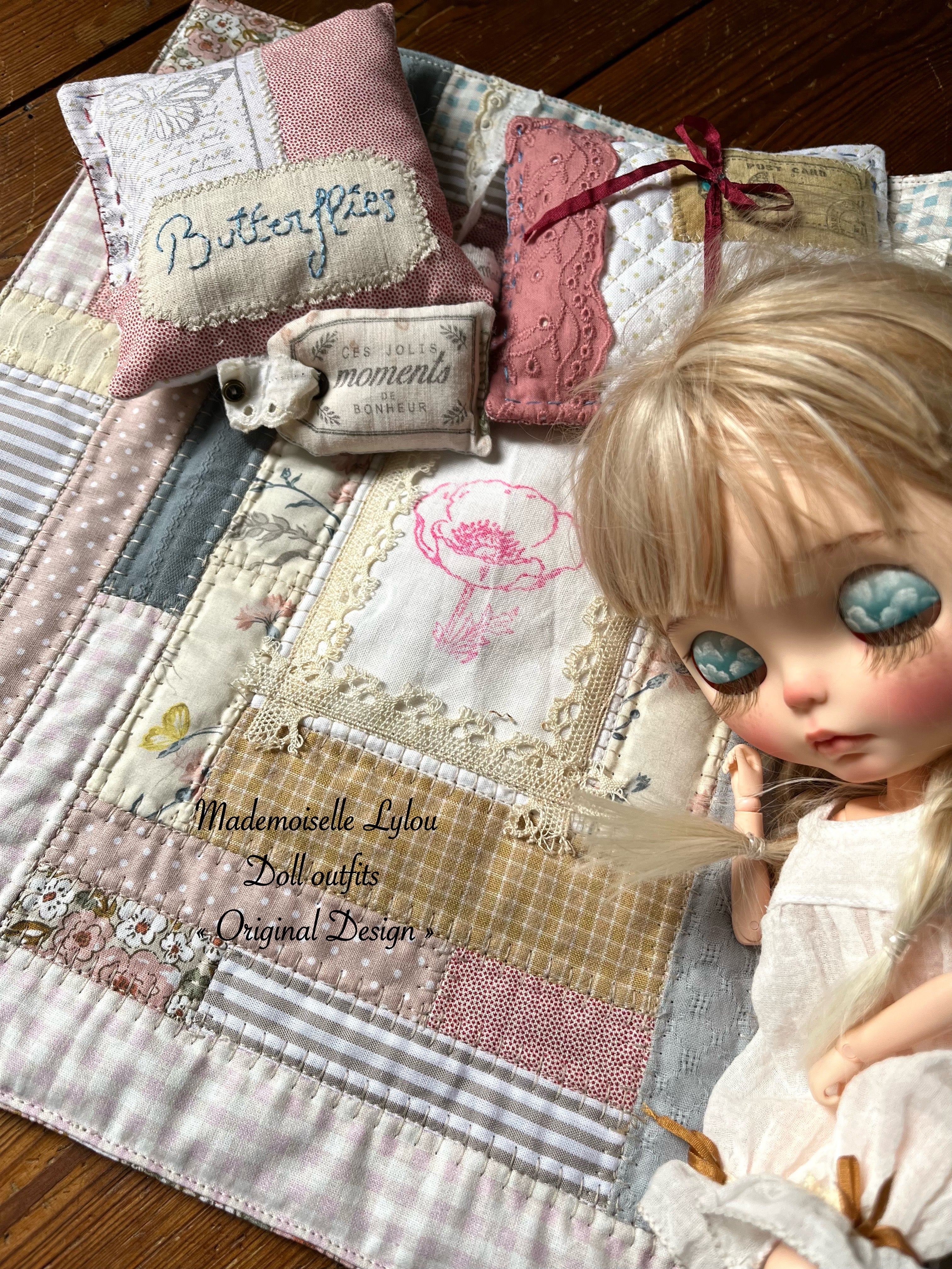 Des ensembles de lit en courte pointe imaginés et confectionnés selon mon imagination. J'utilise tout style de tissus, dentelles vintage, broderies, points de croix, appliqués avec des tampons vintages...Chaque pièce est unique.